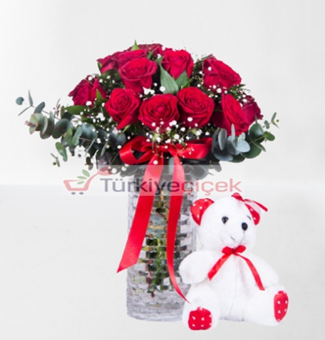 Aşkımızı ve tutkunuzu ifade ederken yanına küçük bir samimiyet eklemek ister misiniz? O halde sevgilinize kırmızı gül buket'i ile birlikte bir pelüş ayıcık vermeyi düşünmelisiniz. Biliyoruz ki aşkın ve tutkunun en büyük temsilcilerinden bir tanesi de kırmızı güllerdir. Sizin söyleyemediğiniz birçok şeyi kırmızı güller kendiliğinden ifade eder. Eğer utangaç biriyseniz hoşlandığınız insanı açılmadan yolu bu kırmızı güllerle çok daha rahat olabilir. Ayrıca yanında bulunan pelüş ayıcıkla onu samimi olarak sevdiğinizi dile getirmiş olacaksınız. Toplamda 15 adet kırmızı gülün bulunduğu cam vazonun dibinde kırmızı taşlar vardır. Güllere yeşillikler ve tip solar eşlik etmektedir. Turkiyecicek.com olarak sevdiklerinize ulaşmanın en kolay yolunu sizlere sunuyoruz.