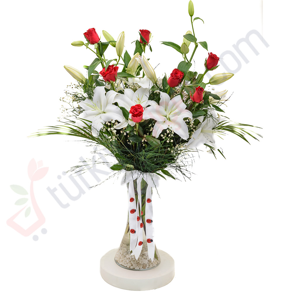 White ceramic pedestal in red roses, pink lisianthus and imported garnishes prepared by arrangement. Will put their loved ones in a corner table design dispenses happiness.